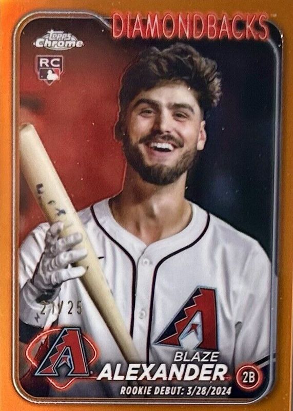 The Blaze Alexander 2024 Topps Chrome Update #USC62 Rookie Debut - Orange Refractor /25 card in Raw condition has not changed in price in the last 30 days and was last sold for $20.00 .