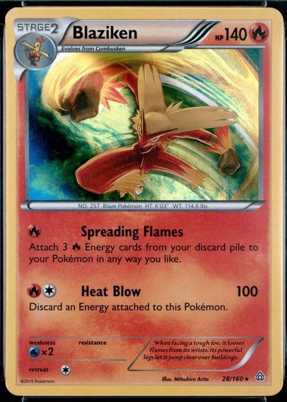 The Blaziken 2015 XY: Primal Clash #028/160 Holo card in Raw TCG (Near Mint) condition has moved down -$1.54 (-51.5%) in the last 30 days and was last sold for $1.45 .