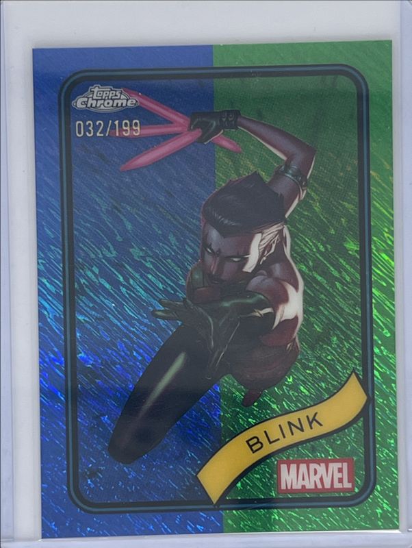 The Blink 2025 Topps Chrome #48 Blue & Green Shimmer Refractor /199 card is 1 of 23 Blink's card variations in the 2025 Topps Chrome set being tracked by Sports Card Investor, including Base, Refractor, Yellow Lava Refractor, Spider Web Refractor /399, and Blue Refractor /299.