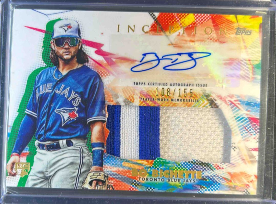 The Bo Bichette 2020 Topps Inception #IAP-BBI Autographs Patch /155 Rookie card is 1 of 40 Bo Bichette's card variations in the 2020 Topps Inception set being tracked by Sports Card Investor, including Base, Green, Purple /150, Magenta /99, and Red /99.