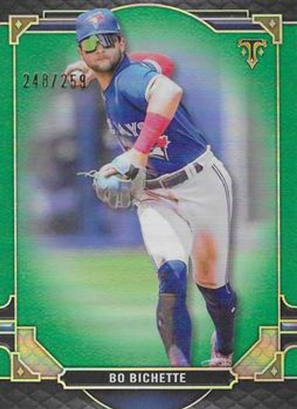 The Bo Bichette 2022 Topps Triple Threads #15 Emerald /259 card is 1 of 105 Bo Bichette's card variations in the 2022 Topps Triple Threads set being tracked by Sports Card Investor, including Base, Amethyst /299, Amber /199, Aquamarine /150, and Tourmaline /125.