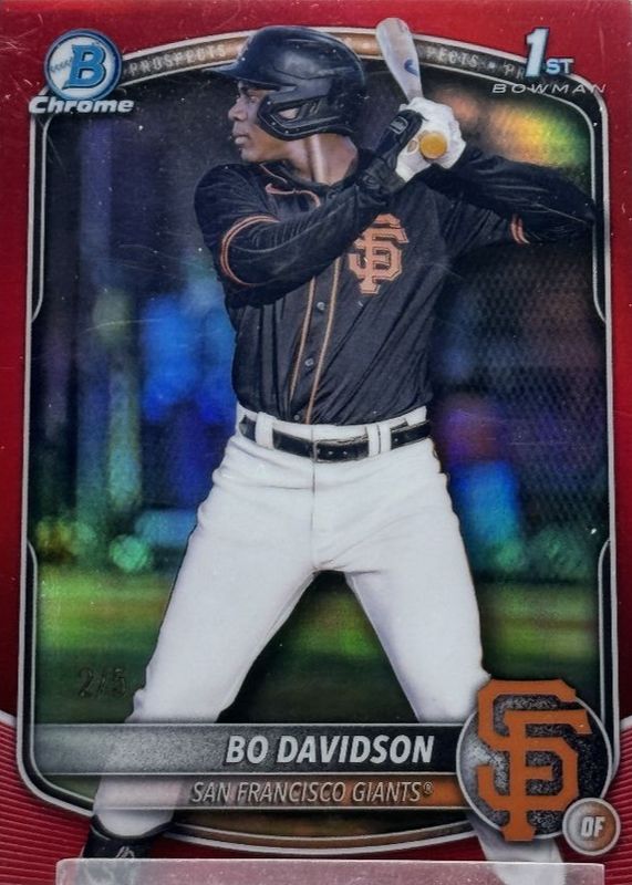 The Bo Davidson 2025 Bowman Chrome #BCP-206 Prospects - Red Refractor /5 (1st) card in Raw condition has not changed in price in the last 30 days and was last sold for $213.50 .