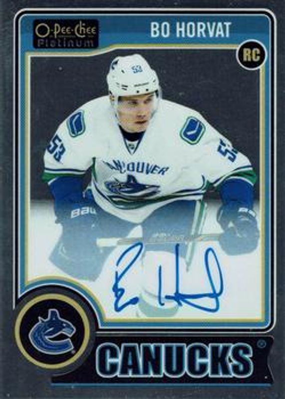 The Bo Horvat 2014 O-Pee-Chee Platinum #RA-2 Rookie Autographs card is 1 of 25 Bo Horvat's card variations in the 2014 O-Pee-Chee Platinum set being tracked by Sports Card Investor, including #173a Base, #173b Base, #173 Platinum Traxx, #173 Rainbow, and #173 White Ice /199.