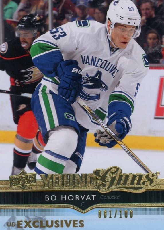 The Bo Horvat 2014 Upper Deck #494 Young Guns - UD Exclusives /100 Rookie card in Raw condition has not changed in price in the last 30 days and was last sold for $110.00 .