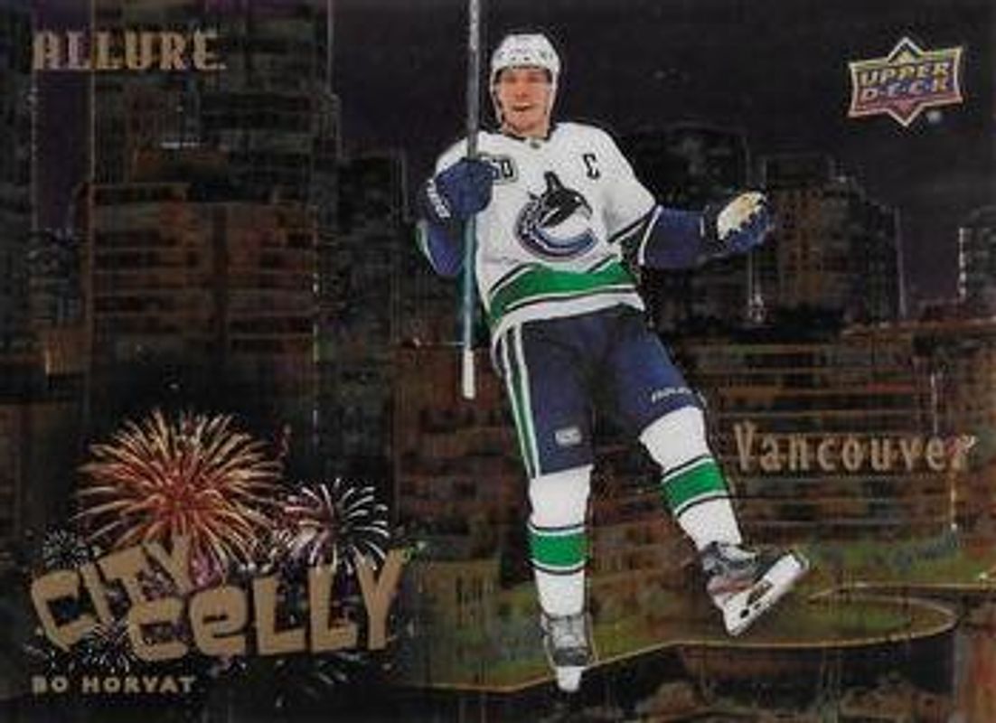 The Bo Horvat 2020 Upper Deck Allure #CC-3 City Celly card is 1 of 31 Bo Horvat's card variations in the 2020 Upper Deck Allure set being tracked by Sports Card Investor, including Base, 2005 Shield, Black Rainbow, Blue China, and Leopard.