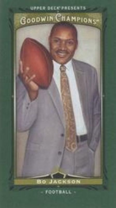The Bo Jackson 2013 Upper Deck Goodwin Champions #3 Mini Green card is 1 of 14 Bo Jackson's card variations in the 2013 Upper Deck Goodwin Champions set being tracked by Sports Card Investor, including Base, Mini, Mini Canvas, Mini Green Blank Back, and Mini Foil Magician Red /13.