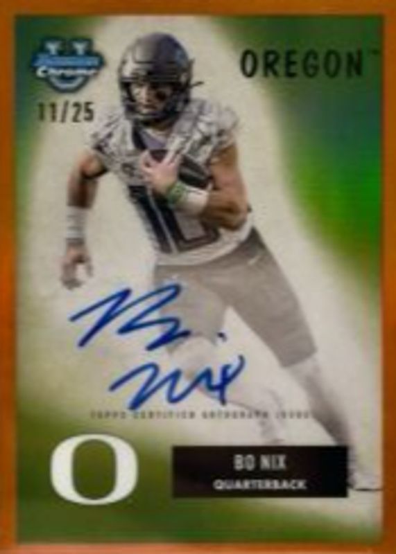 This card is 1 of 22 Bo Nix's card variations in the 2023 Bowman Chrome University set being tracked by Sports Card Investor, including Prospect Auto, Prospect Auto - Refractor /499, Prospect Auto - Fuchsia Mini-Diamond Refractor /150, 1955 Bowman Football Autographs /99, and Prospect Auto - Green Refractor /99.