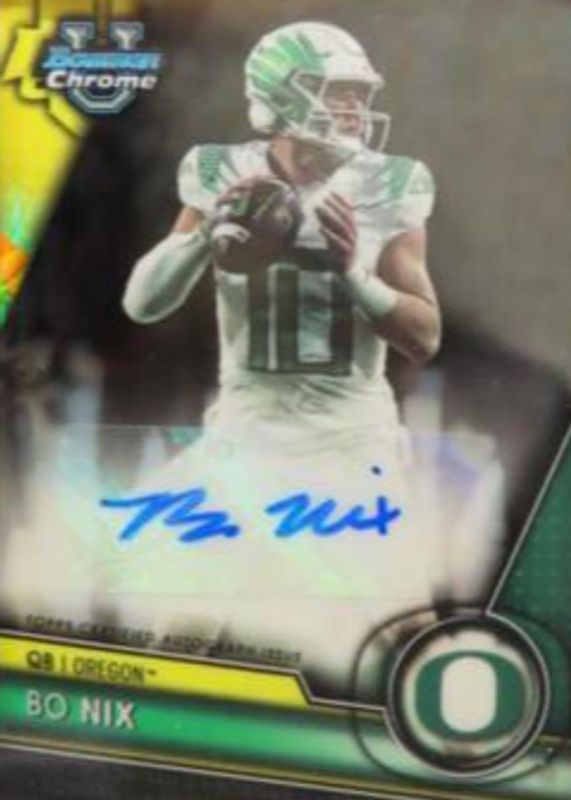 The Bo Nix 2023 Bowman Chrome University Sapphire Edition #PA-NIX Prospect Auto - Black /10 card in Raw condition has not changed in price in the last 30 days and was last sold for $1,499.95 .