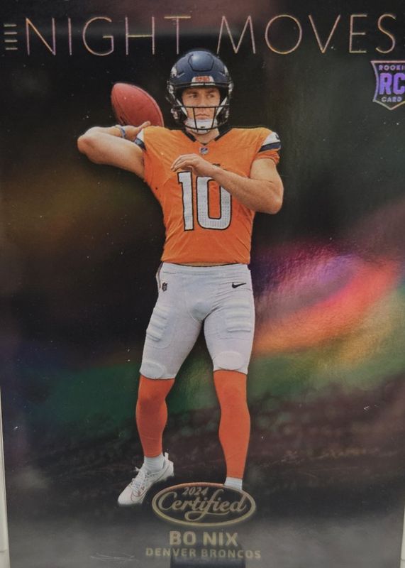 The Bo Nix 2024 Certified #NM-BNX Night Moves /(SSP) Rookie card in Raw condition has not changed in price in the last 30 days and was last sold for $234.00 .