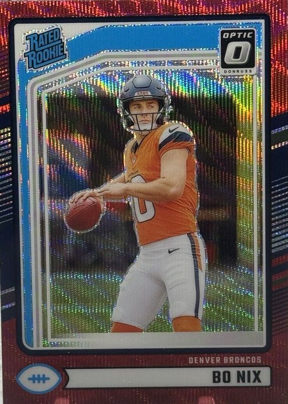 The Bo Nix 2024 Donruss #369 Optic Preview - Red Wave Rookie card in Raw condition has not changed in price in the last 30 days and was last sold for $22.00 .
