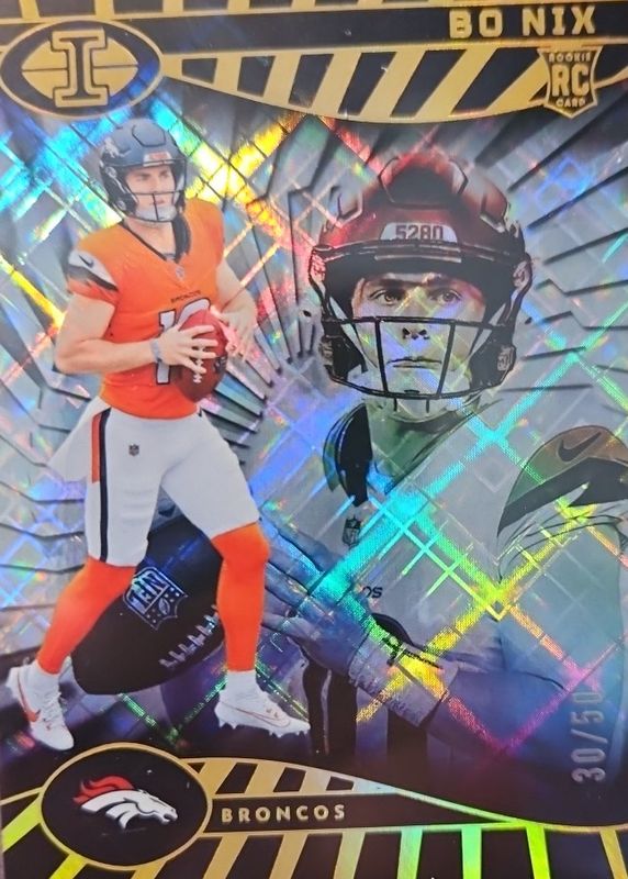 This card is 1 of 25 Bo Nix's card variations in the 2024 Illusions set being tracked by Sports Card Investor, including Base, Retail, Trophy Collection Dots, Trophy Collection Emerald, and Trophy Collection Galactic.