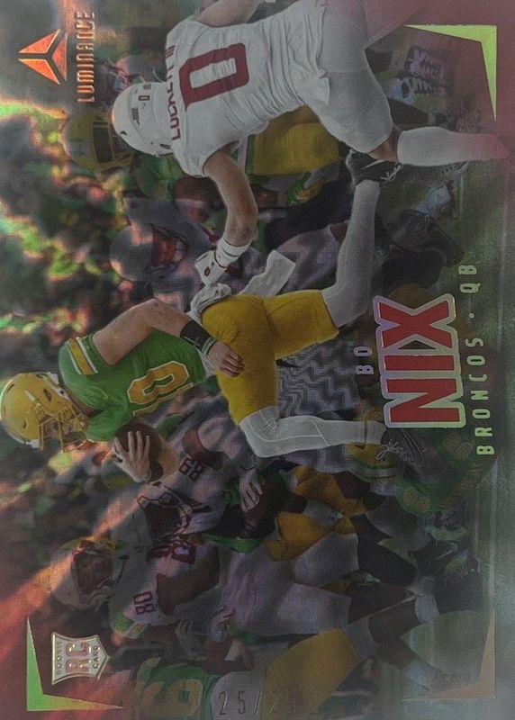 This card is 1 of 22 Bo Nix's card variations in the 2024 Luminance set being tracked by Sports Card Investor, including Horizontal Rookies, Vertical Rookies, Horizontal Rookies - Gold /299, Vertical Rookies - Gold /299, and Horizontal Rookies - Purple /175.