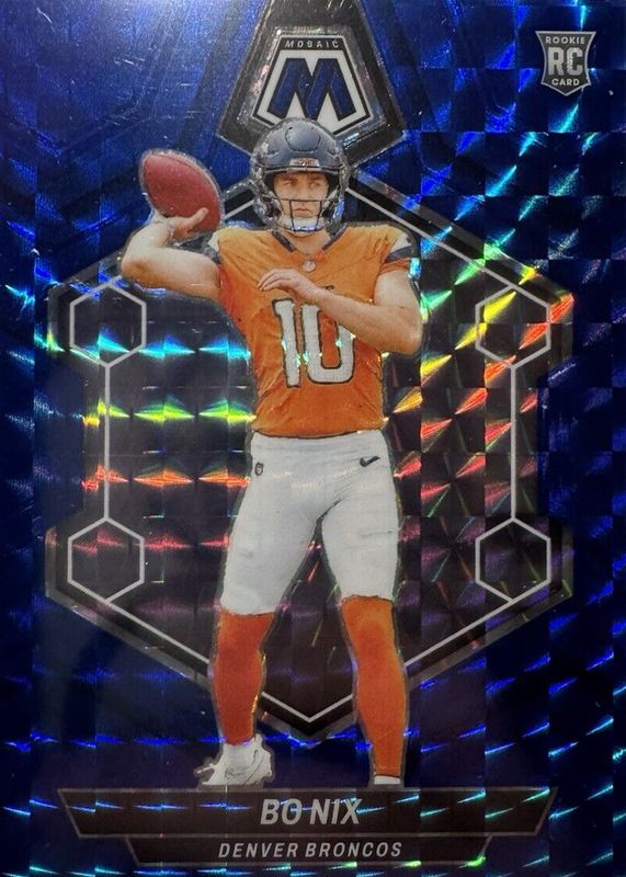 The Bo Nix 2024 Mosaic #312 Blue /99 Rookie card in Raw condition has moved down -$11.00 (-14.7%) in the last 30 days and was last sold for $64.00 .