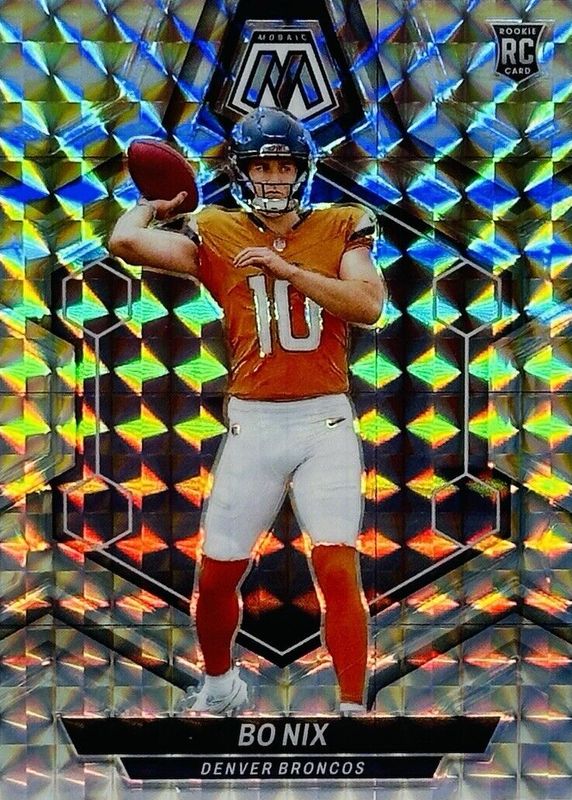 The Bo Nix 2024 Mosaic #312 Mosaic Rookie card in Raw condition has moved up $5.00 (+400%) in the last 30 days and was last sold for $6.25 .