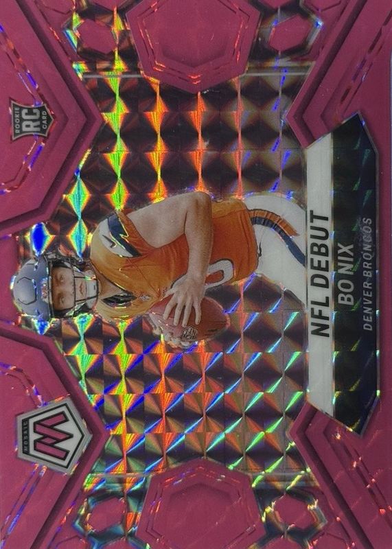 The Bo Nix 2024 Mosaic #271 NFL Debut - Pink Fluorescent /10 Rookie card in Raw condition has not changed in price in the last 30 days and was last sold for $800.00 .