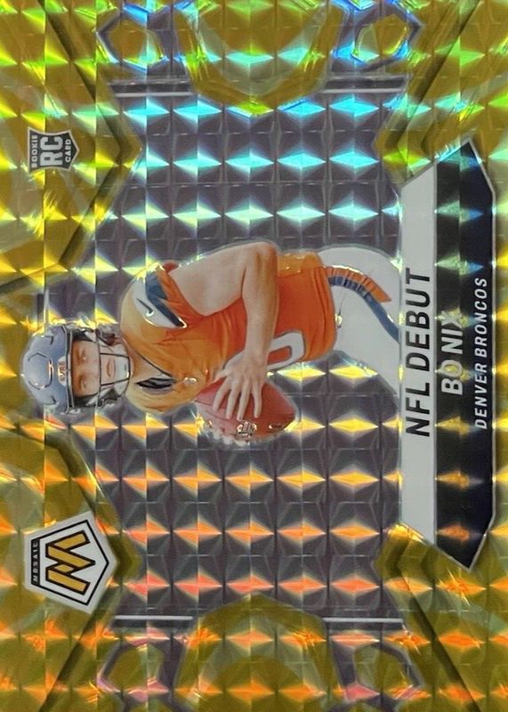 The Bo Nix 2024 Mosaic #271 NFL Debut - Reactive Yellow Rookie card in Raw condition has moved up $0.99 (+6.2%) in the last 30 days and was last sold for $16.99 .