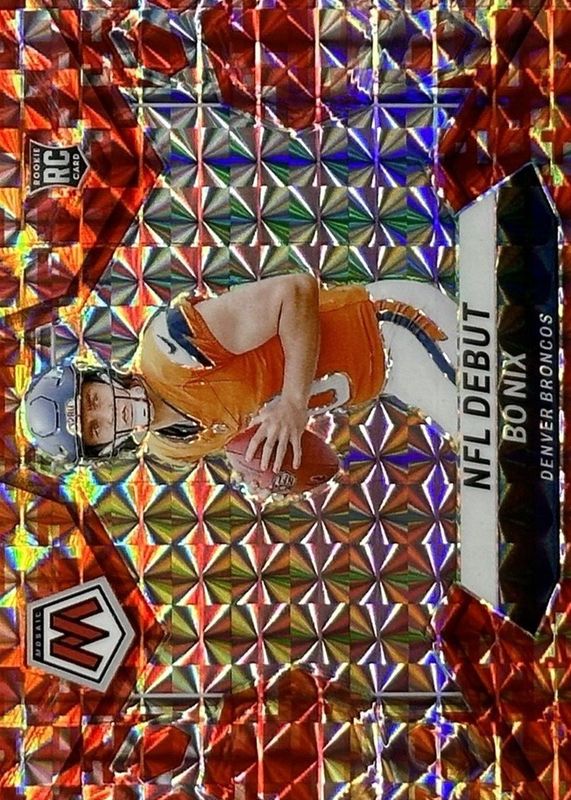 The Bo Nix 2024 Mosaic #271 NFL Debut - Red Camo Rookie card in Raw condition has moved up $2.50 (+33.3%) in the last 30 days and was last sold for $10.00 .