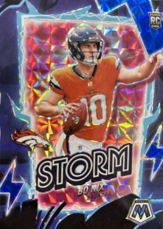The Bo Nix 2024 Mosaic #13 Storm - Blue /99 Rookie card in Raw condition has moved up $5.00 (+11.1%) in the last 30 days and was last sold for $50.00 .