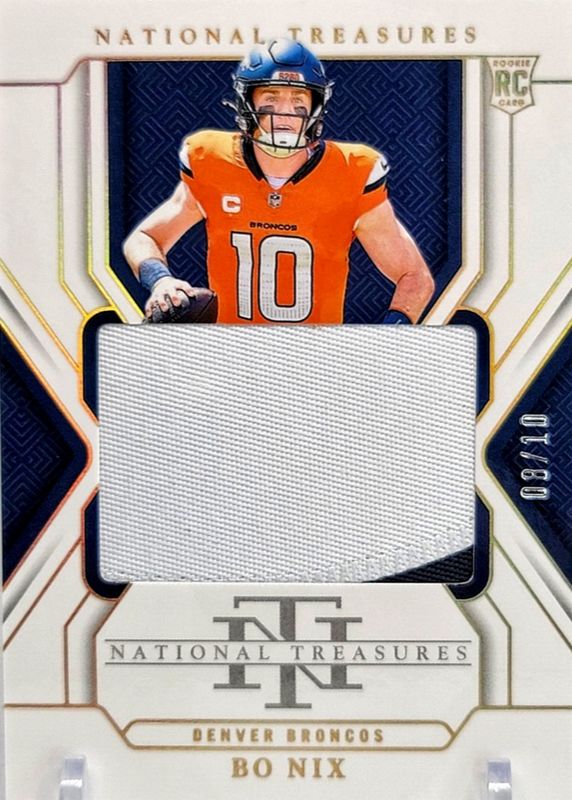 The Bo Nix 2024 National Treasures #209 Rookie Patches - Holo Gold /10 card in Raw condition has not changed in price in the last 30 days and was last sold for $700.00 .