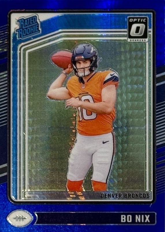 The Bo Nix 2024 Optic #209 Blue Hyper Rookie card in Raw condition has moved up $6.50 (+28.9%) in the last 30 days and was last sold for $29.00 .