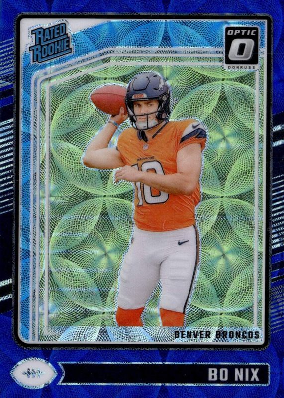 The Bo Nix 2024 Optic #209 Blue Scope Rookie card in Raw condition has moved up $8.00 (+47.1%) in the last 30 days and was last sold for $25.00 .