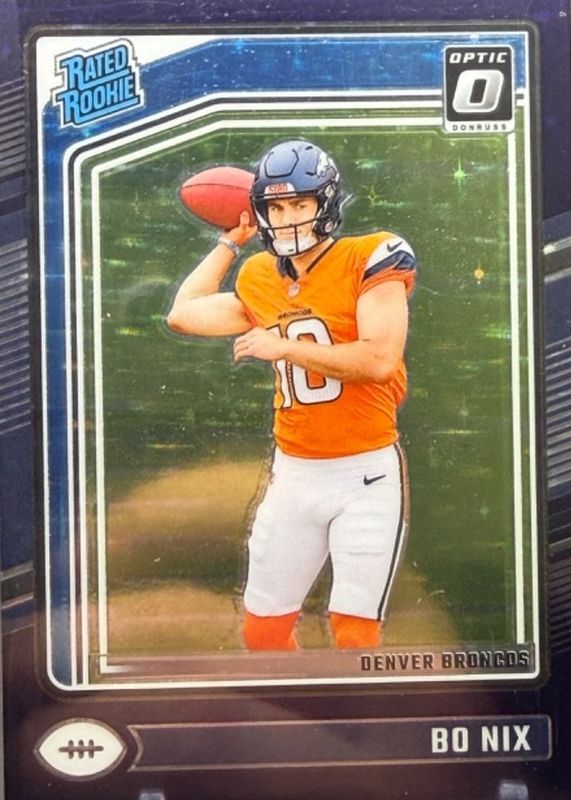 This card is 1 of 108 Bo Nix's card variations in the 2024 Optic set being tracked by Sports Card Investor, including Base, Blue Hyper, Blue Scope, Green Hyper, and Green Velocity.