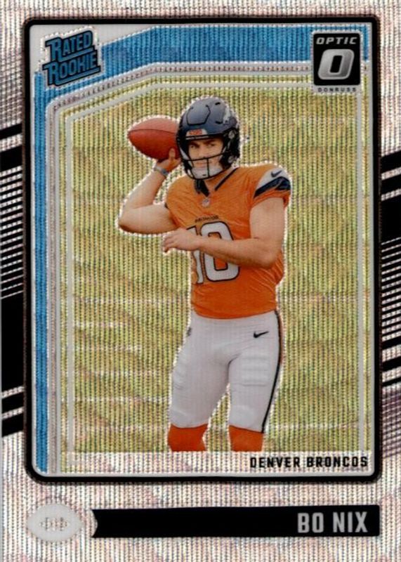 The Bo Nix 2024 Optic #209 Wave /300 Rookie card in Raw condition has moved down -$2.99 (-3.7%) in the last 30 days and was last sold for $77.01 .
