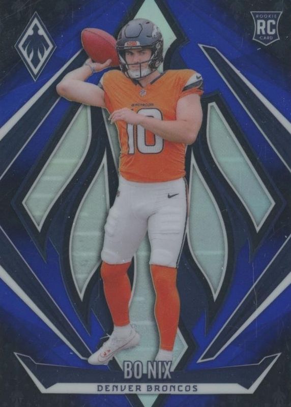 The Bo Nix 2024 Phoenix #159 Blue Fade /249 Rookie card in Raw condition has moved up $5.00 (+33.3%) in the last 30 days and was last sold for $20.00 .