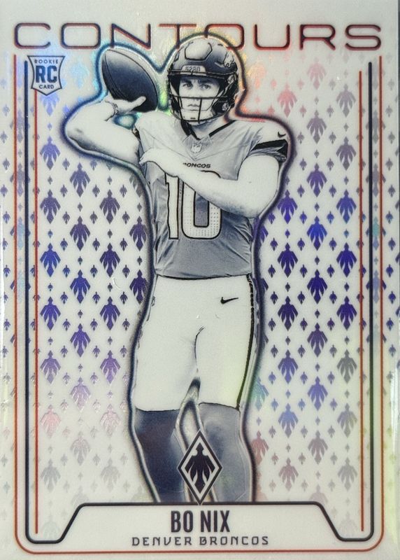 The Bo Nix 2024 Phoenix #CON-BNX Contours - Purple Rookie card in Raw condition has moved up $8.00 (+200%) in the last 30 days and was last sold for $12.00 .