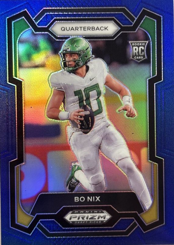 The Bo Nix 2024 Prizm Draft Picks #105 Blue /199 Rookie card in Raw condition has not changed in price in the last 30 days and was last sold for $12.00 .