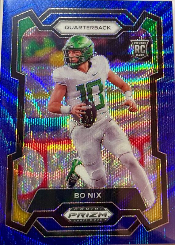 The Bo Nix 2024 Prizm Draft Picks #105 Blue Wave /249 Rookie card in Raw condition has moved down -$0.74 (-4.1%) in the last 30 days and was last sold for $17.25 .