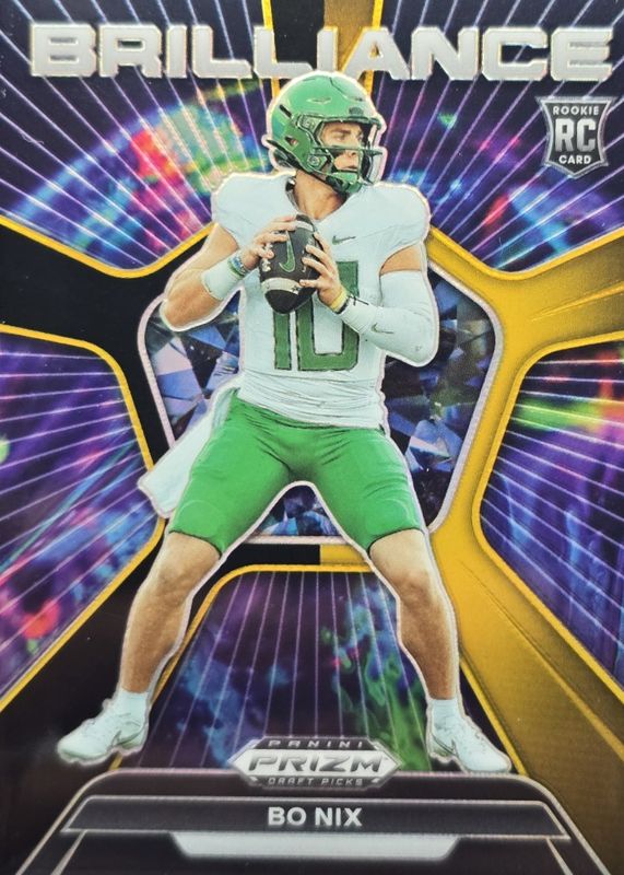 The Bo Nix 2024 Prizm Draft Picks #BR-BN Brilliance - Black & Gold /5 Rookie card in Raw condition has not changed in price in the last 30 days and was last sold for $149.00 .
