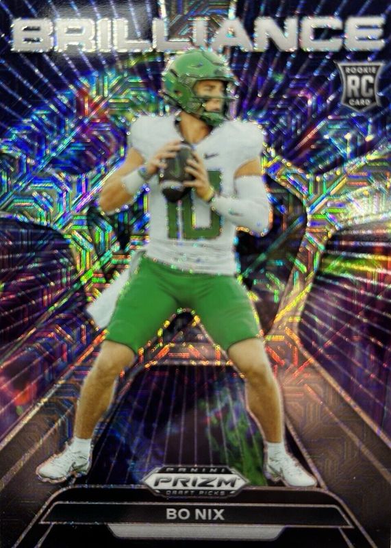 The Bo Nix 2024 Prizm Draft Picks #BR-BN Brilliance - Mojo /25 Rookie card in Raw condition has not changed in price in the last 30 days and was last sold for $110.00 .