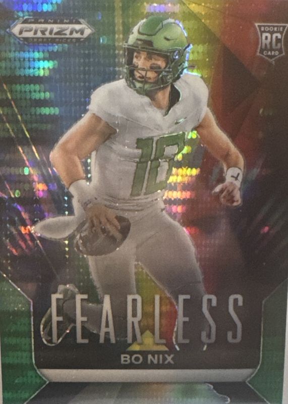 The Bo Nix 2024 Prizm Draft Picks #F-BN Fearless - Green Pulsar /25 Rookie card in Raw condition has not changed in price in the last 30 days and was last sold for $55.00 .