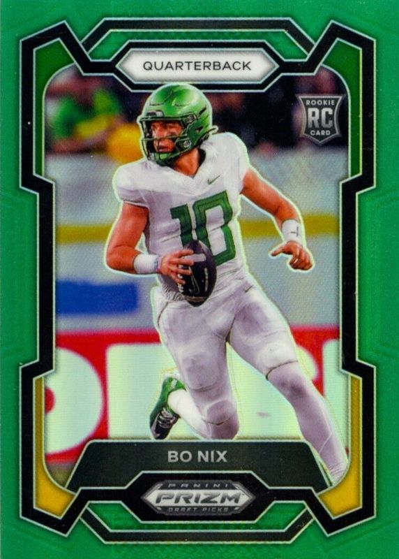 The Bo Nix 2024 Prizm Draft Picks #105 Green Rookie card in Raw condition has moved up $1.76 (+41.5%) in the last 30 days and was last sold for $6.00 .