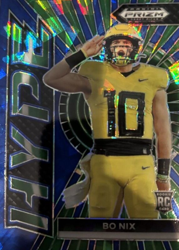The Bo Nix 2024 Prizm Draft Picks #HP-BN Hype - Blue Ice /99 Rookie card in Raw condition has not changed in price in the last 30 days and was last sold for $15.00 .