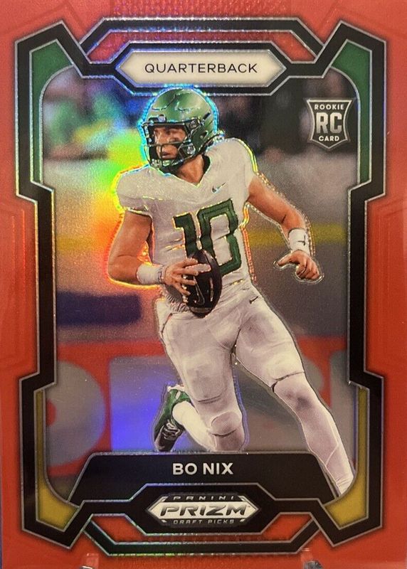 The Bo Nix 2024 Prizm Draft Picks #105 Red /299 Rookie card in Raw condition has moved down -$1.12 (-10.1%) in the last 30 days and was last sold for $9.99 .