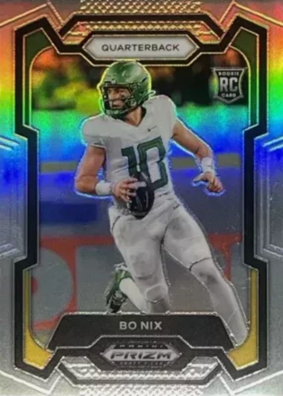 This card is 1 of 86 Bo Nix's card variations in the 2024 Prizm Draft Picks set being tracked by Sports Card Investor, including Base, Green, Purple Wave, Red Ice, and Ruby Wave.