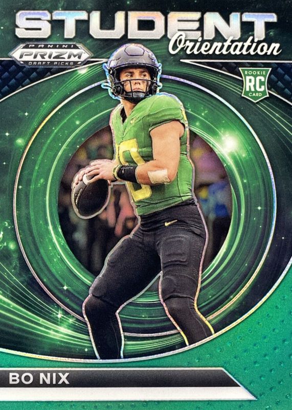 The Bo Nix 2024 Prizm Draft Picks #SO-BN Student Orientation - Green Rookie card in Raw condition has moved up $1.09 (+88.0%) in the last 30 days and was last sold for $2.34 .