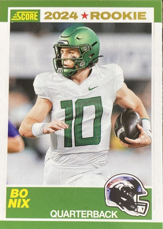 This card is 1 of 75 Bo Nix's card variations in the 2024 Score set being tracked by Sports Card Investor, including Base, Gold, Green, Orange, and Purple.