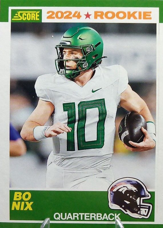 This card is 1 of 75 Bo Nix's card variations in the 2024 Score set being tracked by Sports Card Investor, including Base, Gold, Green, Orange, and Purple.