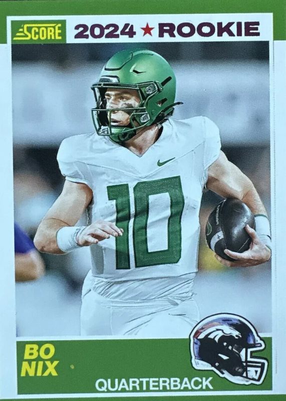 This card is 1 of 75 Bo Nix's card variations in the 2024 Score set being tracked by Sports Card Investor, including Base, Gold, Green, Orange, and Purple.