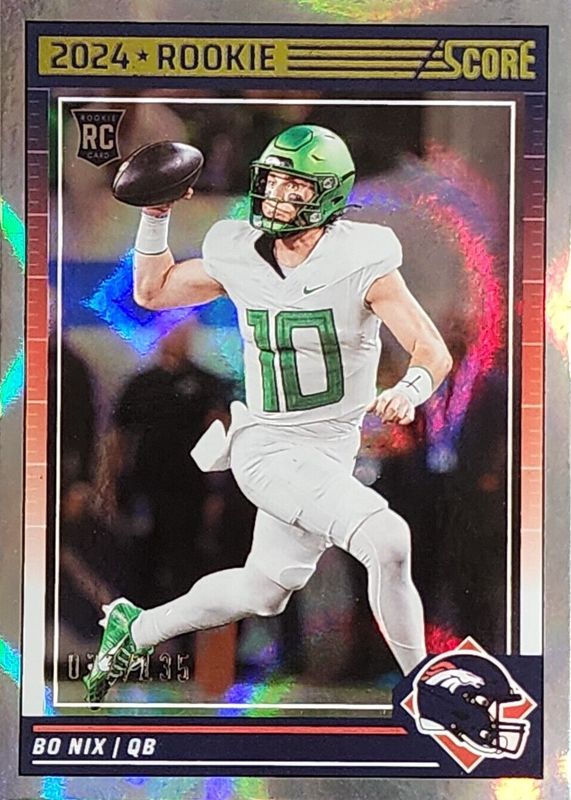 This card is 1 of 75 Bo Nix's card variations in the 2024 Score set being tracked by Sports Card Investor, including Base, Gold, Green, Orange, and Purple.