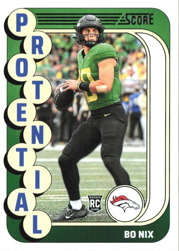 The Bo Nix 2024 Score #11 Protential Rookie card in Raw condition has moved up $0.46 (+39.5%) in the last 30 days and was last sold for $1.63 .