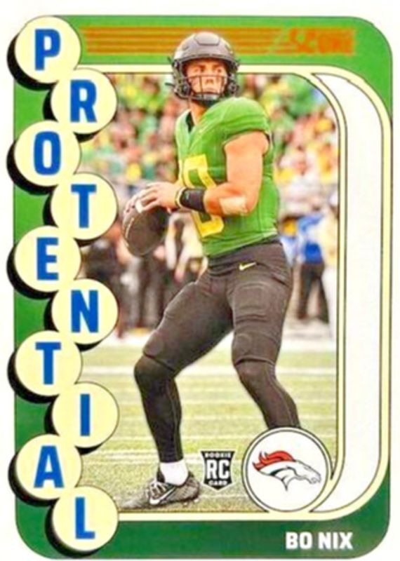 The Bo Nix 2024 Score #11 Protential - Orange Rookie card in Raw condition has not changed in price in the last 30 days and was last sold for $13.75 .