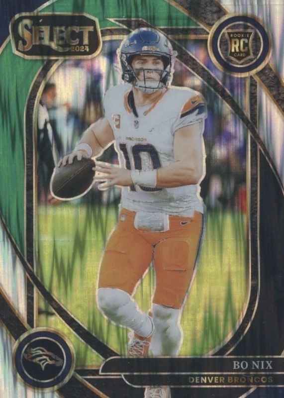 The Bo Nix 2024 Select #221 Club Level Black & Green Shock Rookie card in Raw condition has moved up $2.75 (+64.7%) in the last 30 days and was last sold for $7.00 .