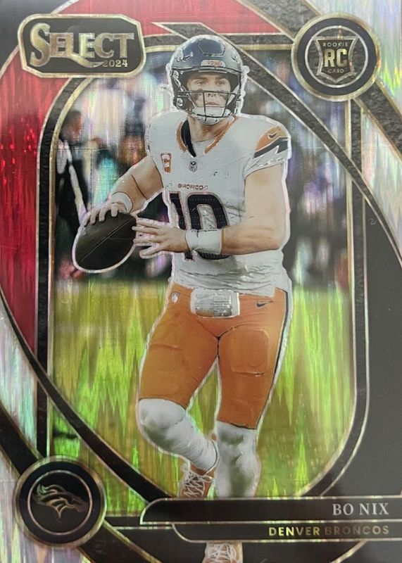 The Bo Nix 2024 Select #221 Club Level Black & Red Shock Rookie card in Raw condition has moved up $0.12 (+1.7%) in the last 30 days and was last sold for $7.25 .