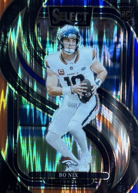 Best Prices Available For Sale of Bo Nix 2024 Select #117 Premier Level Blue & Orange Shock /35