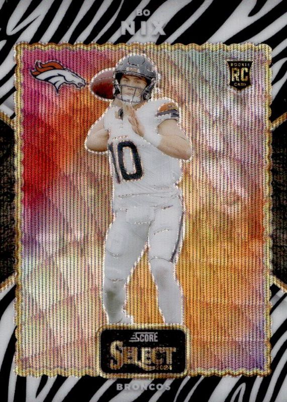 The Bo Nix 2024 Select #23 Score Select Throwback - Zebra /(SSP) Rookie card in Raw condition has not changed in price in the last 30 days and was last sold for $384.60 .