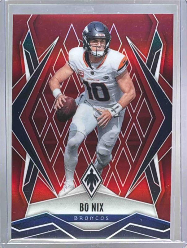The Bo Nix 2025 Phoenix #83 Red /99 card is 1 of 143 Bo Nix's card variations in the 2025 Phoenix set being tracked by Sports Card Investor, including Base, Silver, Silver Hyper, Silver Lava, and Silver Lazer.
